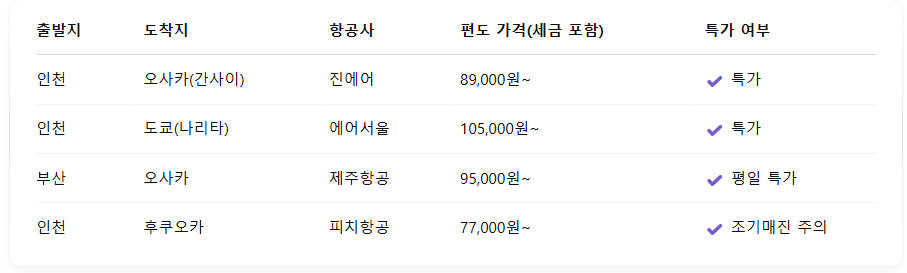 3. 오사카·도쿄 인기 노선 특가 현황 (2025년 기준, 예시)
