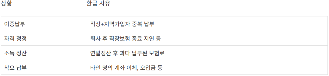건강보험료를 과다 납부했거나, 자격 변경·중복 납부·소득 정산 등의 이유로 국민건강보험공단이 돌려주는 돈이며 대부분의 환급금은 신청하지 않으면 자동 소멸되니 잘 알아보시기 바랍니다.