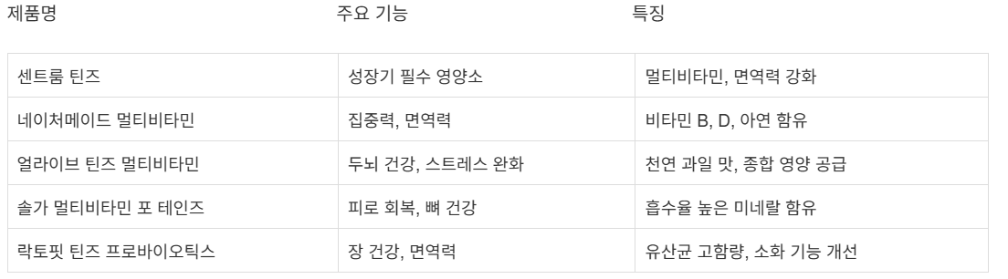고등학생 시기는 체력, 집중력, 면역력 모두가 중요한 시기이며 꾸준한 영양 관리가 성적 향상과 건강한 성장의 기본이 되니, 자녀에게 맞는 종합영양제를 선택해 더 나은 내일을 준비해 보시기 바랍니다.