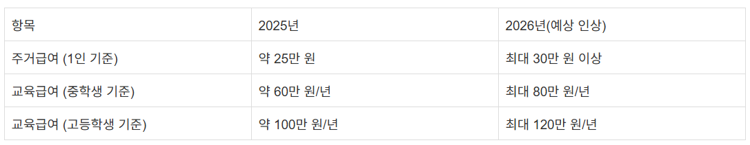 이 두 제도는 매년 예산 편성과 물가, 주거비, 교육비 현실화 수준에 맞춰 금액이 조정되고 있으며, 2026년에는 역대 최대폭의 인상이 확정되었습니다.