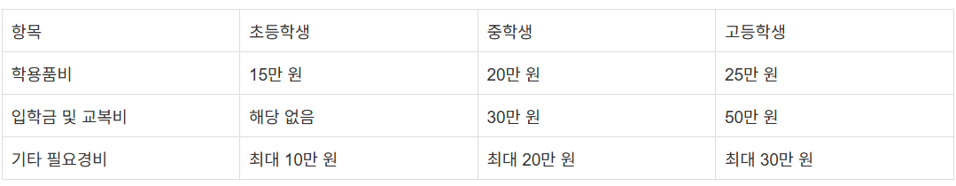 - 교육급여: 초·중·고등학생에게 학용품비, 입학금, 교복비 등을 지원하는 교육 지원 제도