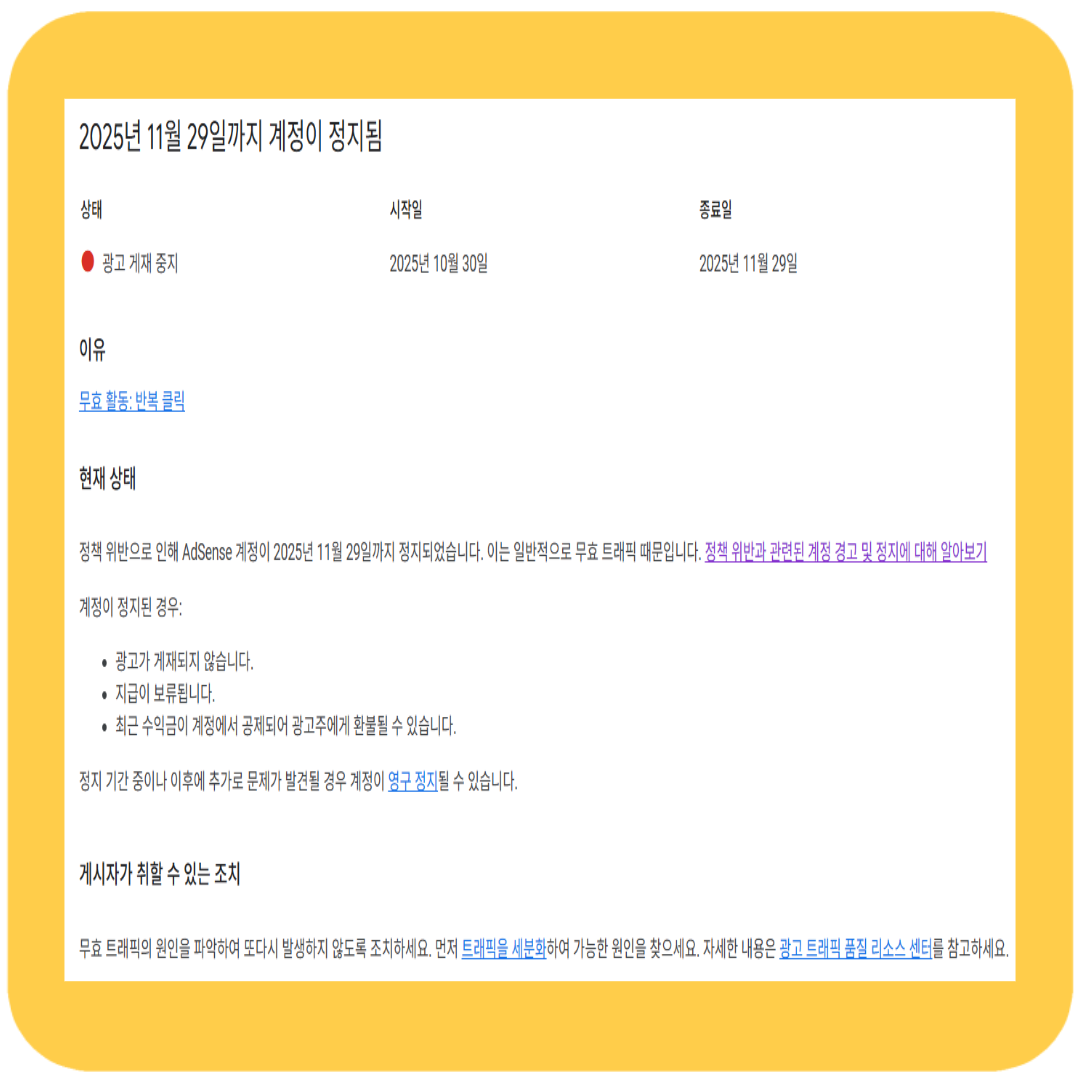 최근 많은 블로거들이 겪고 있는 상황, 바로 애드센스 무효 트래픽 정지입니다. 저 역시 2025년 10월 30일, 구글로부터 무효 활동(반복 클릭)을 이유로 광고 중지 조치를 받았습니다. 🔒 광고는 비활성화되고, 수익은 정지. 하지만 정확한 대응만 한다면 복구는 충분히 가능합니다.